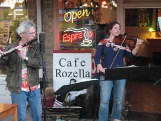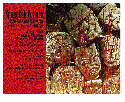 Thanks to all who came to see/hear us at Café Rozella – the café is calling the event a “smashing success”! It was a wonderful evening, and packed (sorry to those who couldn't get in the door) and we already have requests for a cd (we'll make one soon) We played on Wednesday, January 30, 2008 as part of "Spanglish Potluck", an evening of words and music presented by Hedgebrook, the internationally-known writers' retreat on Whidbey Island. This event took place at Cafe Rozella, in White Center (see www.caferozella.com for more details). For this event I was so fortunate to be joined by Fred Hoadley (tres), Ben Verdier (bass), Jim O'Halloran (flute), and Andy Schloss (percussion).
